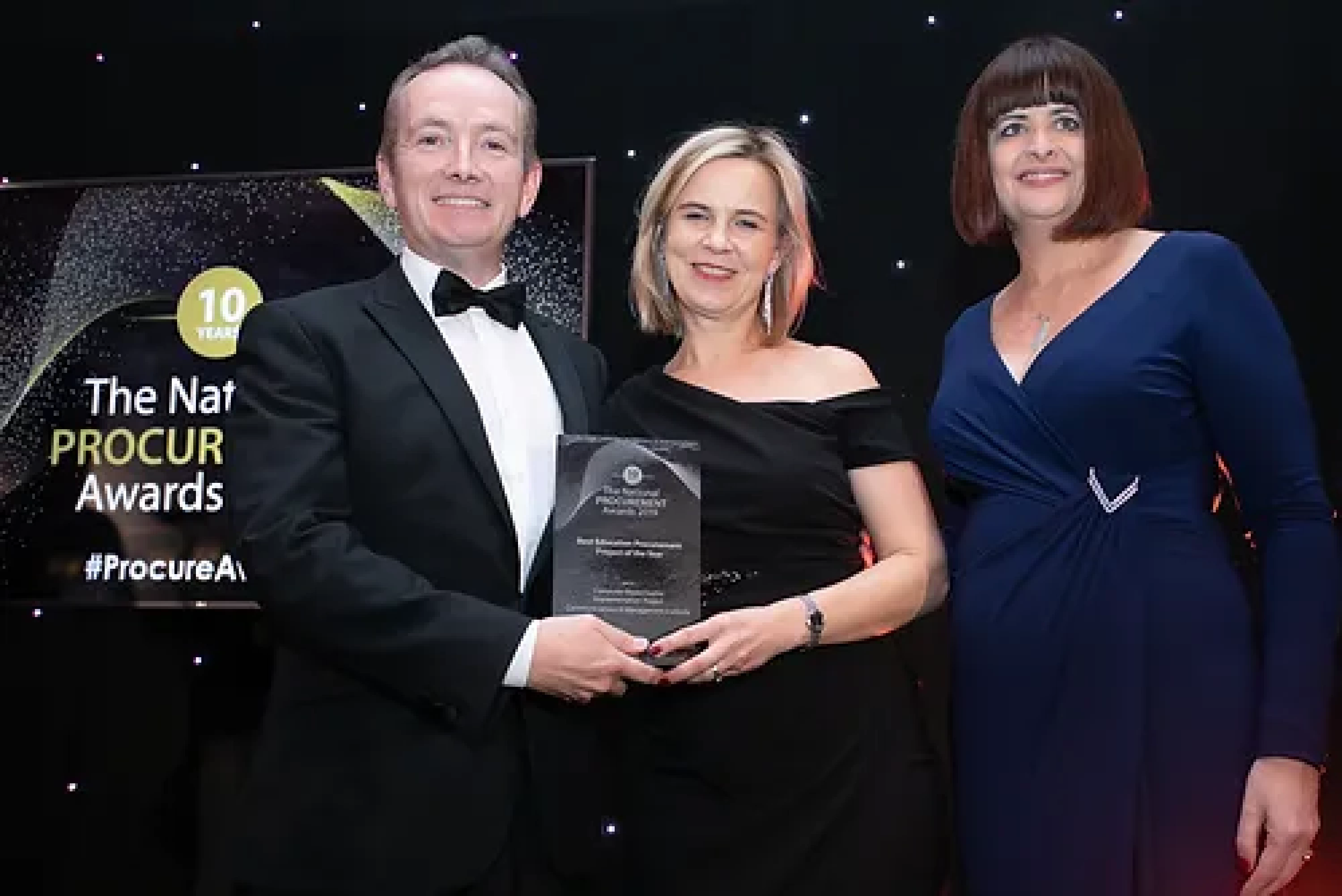 Eavan O'Halloran, Awards Judge presents the Best Education Procurement Project of the Year award to John O’Toole & Natalie O’Toole, Communications & Management Institute.